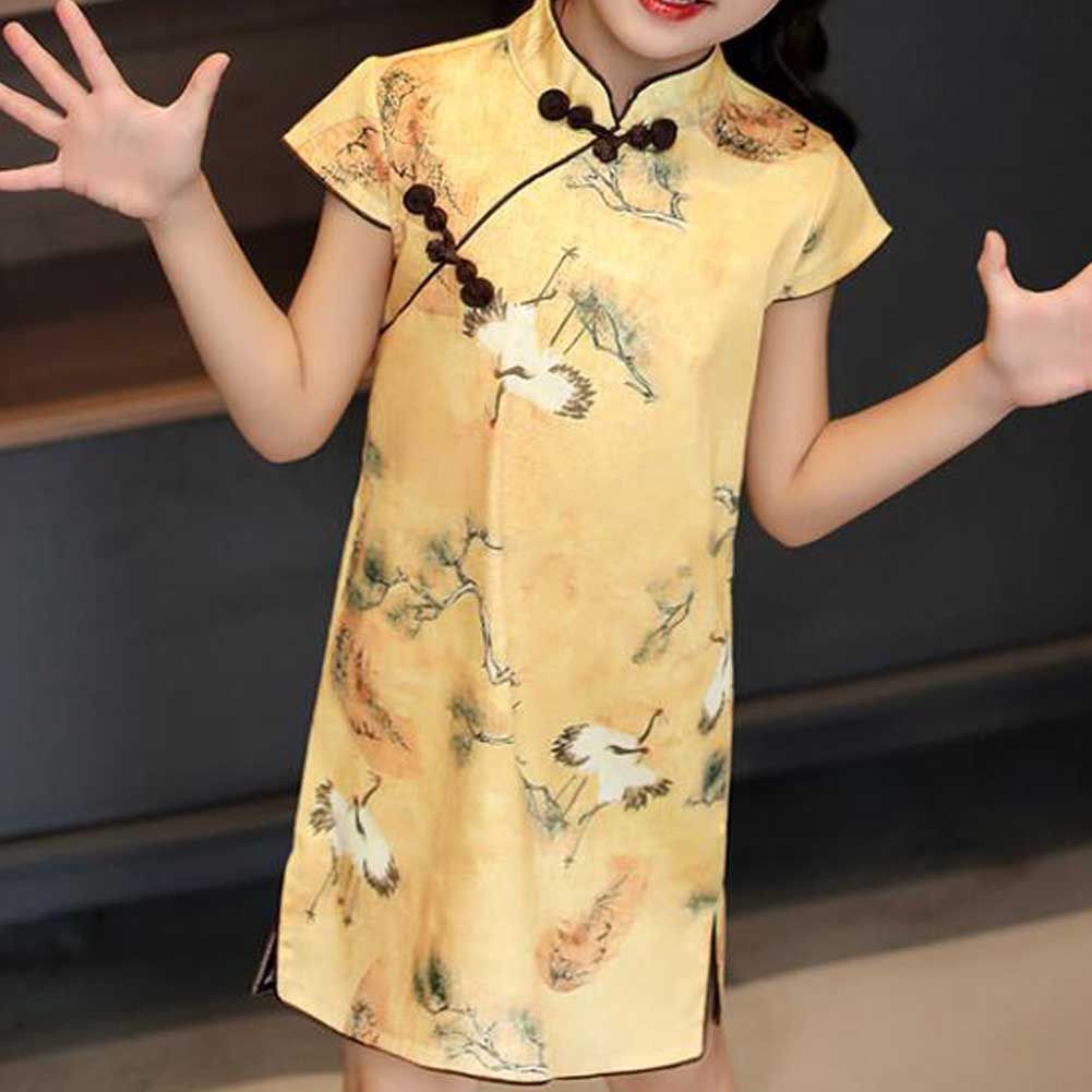 Girls Retro Crane Cheongsam Dress Chinese Style Yellow Summer Dress